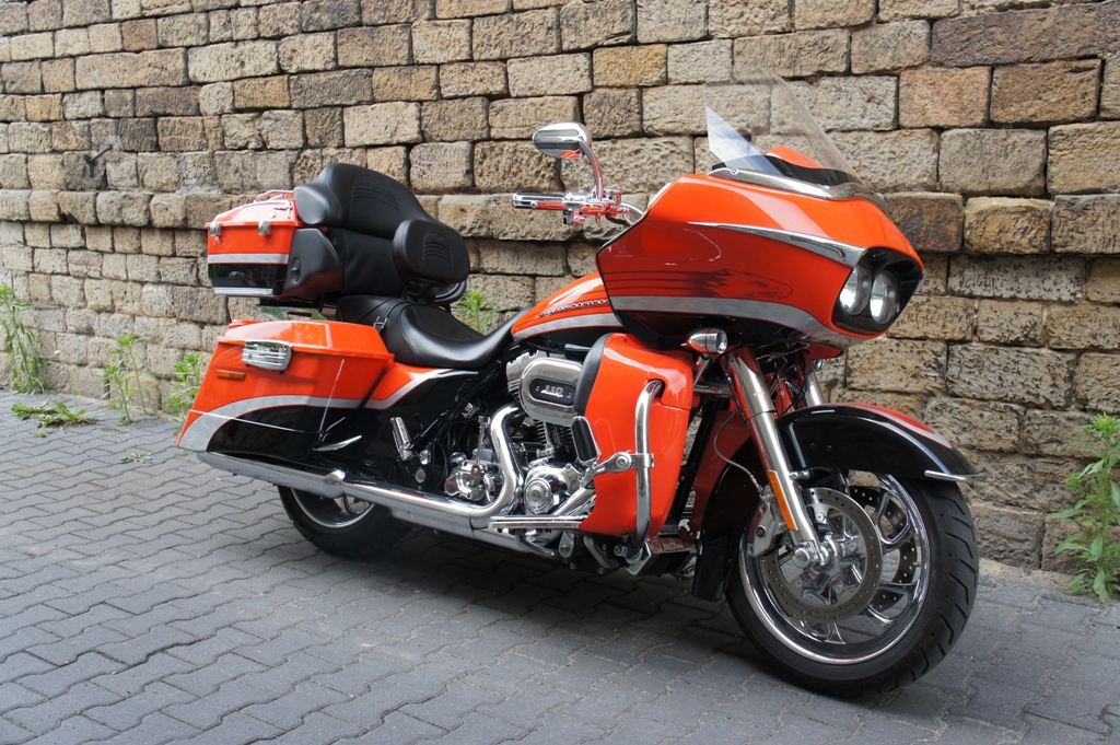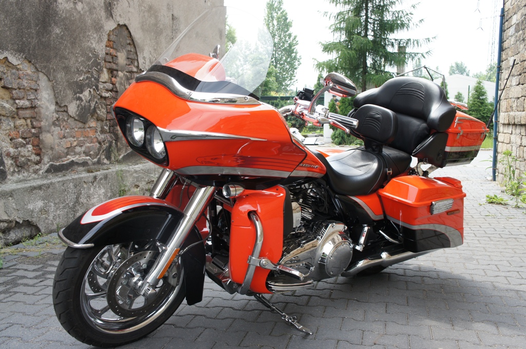 Oto moj nowy Road Glide CVO 110" - dla wiekszosci najbrzydszy Harley swiata. Dla mnie cel od dluszego czasu. Dzieki tej wielkiej owiewce prowadzi sie bajecznie, zamocowana do ramy tnie powietrze cala masa motocykla (ok. 390kg). Mijanie pedzacego TIR'a nie powoduje juz trzepania kierownica. Do tego na Autobahn'ie w DE mozna utrzymywac 160-180km/h bez problemu. Oby tylko sie nie psul, bo to nie jest juz taki prosty motocykl jak moj poprzedni.