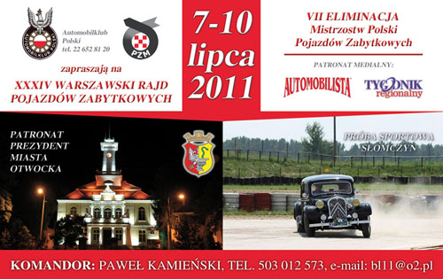 Komisja Pojazdów Zabytkowych Automobilklubu Polski, ma zaszczyt zaprosić na XXXIV WARSZAWSKI RAJD POJAZDÓW ZABYTKOWYCH, będący VI RUNDĄ MPPZ 2011. Impreza odbędzie się w dniach 07-10.07.2011 r.