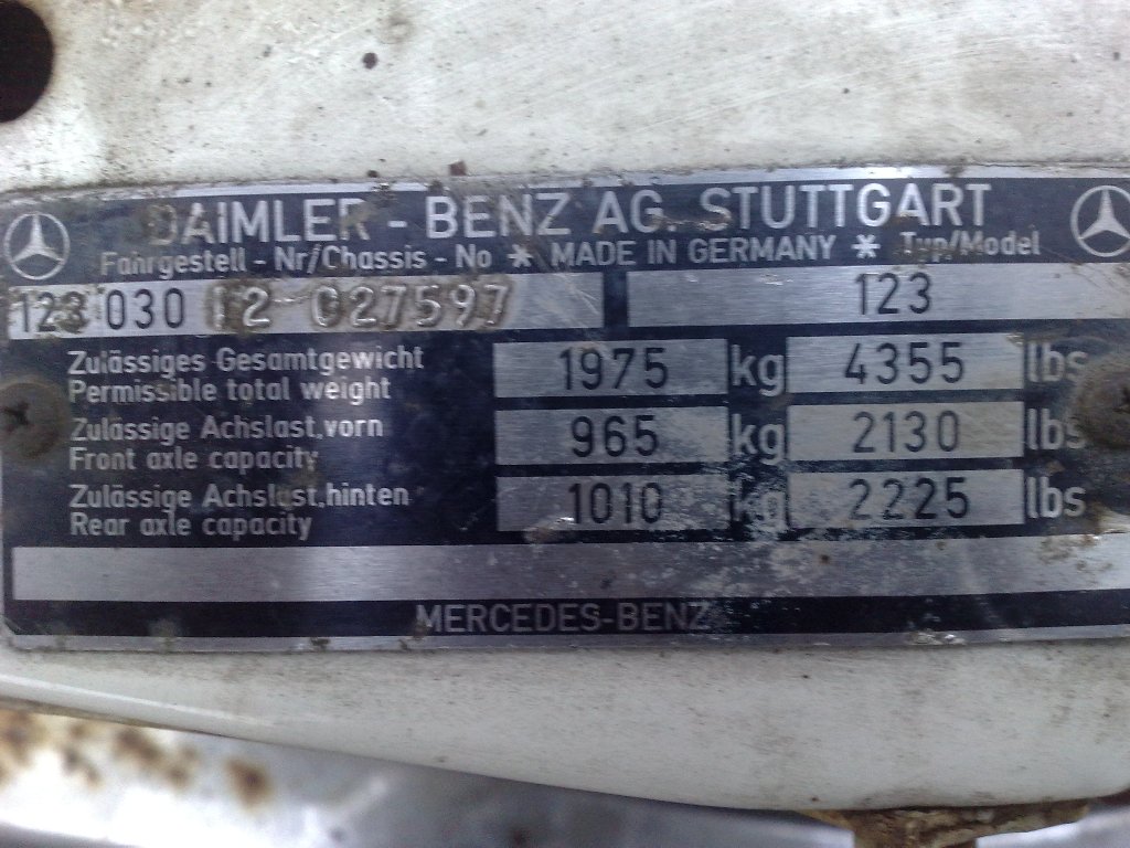VIN WDB12303012027597 Model 280 Chassis 12303012027597 Engine 110923 12 017238 Transmission 020436 71 Order 0 8 215 02414 Approx. year 1978 Dealer Moenchen-Gladbach branch (215) Interior fabric mushroom+quartz (005) Paint 737 classic white (T) (с 01.01.1975 по 31.12.1985) Options 260 elimination of model designation on rear lid (с 01.05.1968) 286 luggage nets on front seat backrests (с 01.01.1962) 404 orthopaedic front seat backrest (multiple contour backrest in model 140), left (с 01.04.1970 по 31.12.1995) 410 electric sliding roof (с 01.03.1965 по 29.02.1988) 420 automatic transmission, floor shift (с 01.01.1963) 430 headrests in the rear (с 01.01.1977) 466 central locking system (с 01.04.1970 по 31.10.1993) 480 self-levelling suspension (с 01.03.1965) 502 outside rear view mirror, on the right (с 01.01.1963 по 31.03.1983) 511 Becker radio cassette stereo MW/USW (с 01.01.1973 по 31.07.1981) Becker radio Mexico cassette full stereo Becker radio Monza cassette stereo LW/MW/SW/USW 550 trailer coupling (с 01.03.1965) 561 front seat, left, reinforced (с 01.04.1970) 590 heat-insulating glass, all-around, heated rear window pane (laminated glass), Germany green heat-insulating glass all round, heated rear window, laminated safety glass - Germany (с 01.01.1972) 656 Michelin tires (с 01.08.1965 по 31.10.1989) 682 fire extinguisher (с 01.04.1970)