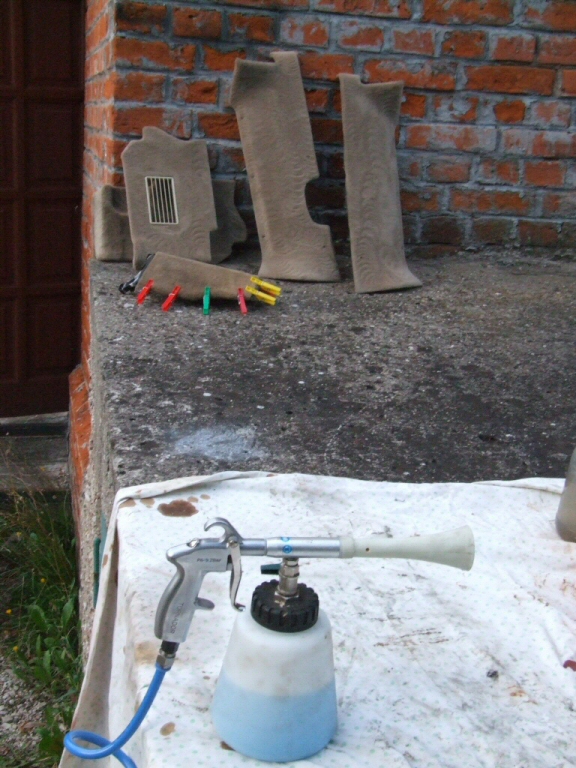 Komentarz: ...później było pranie tapicerki. Na pierwszym planie pistolet piorący na sprężone powietrze. Środkiem piorącym jest aktywne piana, nakładana pod dużym ciśnieniem na prace miejsce..