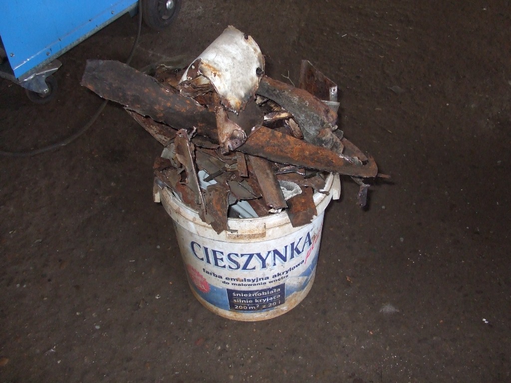 Arkusz blachy 2m kwadratowe. Jak myślicie wystarczył jeden? Załącznik: Nie... Poszły prawie całe dwa... W zamian sporo ścinków do przetopienia. Załącznik: Oraz o ile dobrze pamiętam cztery takie wiadra rdzy... Załącznik: Strasznie nędzny to był widok Załącznik: