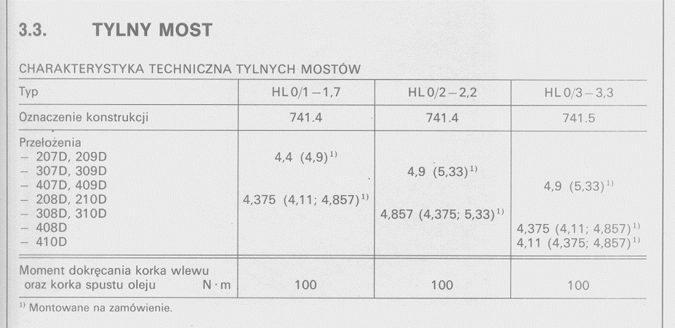 Tabliczka z przełożeniem powinna być przynitowana z tyłu mostu, koło klapki dyfra, z prawej strony. Możesz się pokusić o zmianę skrzyni (łatwiej niż kombinować z mostem, pozostaje blokada itp). Teraz masz na I zapewne przełożenie 6,15, kwestia tego, czy masz na niej wystarczający zapas momentu, że po zmianie na skrzynię z nadbiegiem, wystarczy jej jedynka mająca tylko 4.7. Bo obie skrzynie pasują zamiennie, ta sama obudowa tylko koła inne. |
